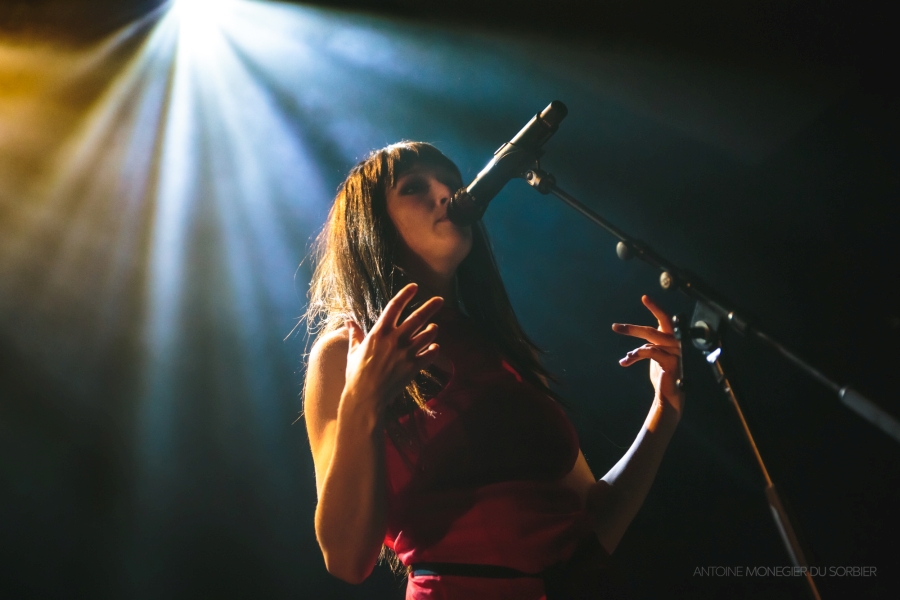 Notre seule appréhension de la soirée était de voir comment le groupe parviendrait à traduire sur scène ses morceaux aux structures alambiquées et fignolés par un travail d'orfèvre en studio. Une qualité sonore impeccable semblait déjà une condition sine qua non pour en juger. Fort heureusement, cette petite salle jouit d'une excellente acoustique et si le groupe débute largement en retard son concert, il a bien fait attention à ne pas bâcler ses balances. Prenant place côté jardin, Taylor Skye est entourée d'un nombre incalculable de machines. On compte pas moins de trois synthétiseurs, un sampler et d'autres objets technologiques non identifiés. Mais c'est vers le côté cour que tous les yeux convergent, là où se tient entre le microphone, sa guitare et son violon, la belle Georgia Ellery. La jeune anglaise, dans l'ombre avec Black Country, New Road, mènera ce concert d'une main de maître faisant preuve de charisme et d'un insoupçonné talent de show-woman.