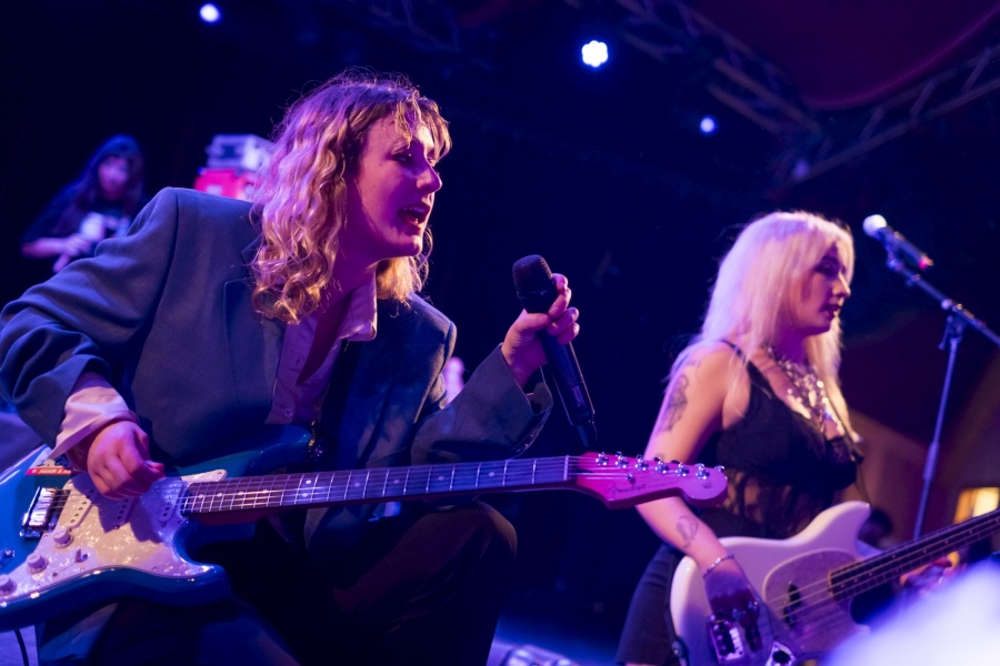Lambrini Girls. Devant un public étonnamment varié en âges et en genres, Phoebe Lunnyà la guitare dans un costard quatre tailles trop grand, Lilly Macieira-Boşgelmez à la basse en résilles et chaînes en or qui brillent, et comme déjà en février à la Maroquinerie, Misha Phillips derrière une grosse caisse ornée du message « Trans Kids Deserve Better » (ndlr : les jeunes trans méritent mieux). Un slogan et une association travaillant pour les droits des trans et l'aide des jeunes trans en difficulté (pléonasme), et si vous êtes de la team « pas de politique dans ma musique » il est encore temps de faire demi-tour, ou de reconnaître que toute forme d'art est intrinsèquement politique, à différents degrés de visibilité et de subtilité.
